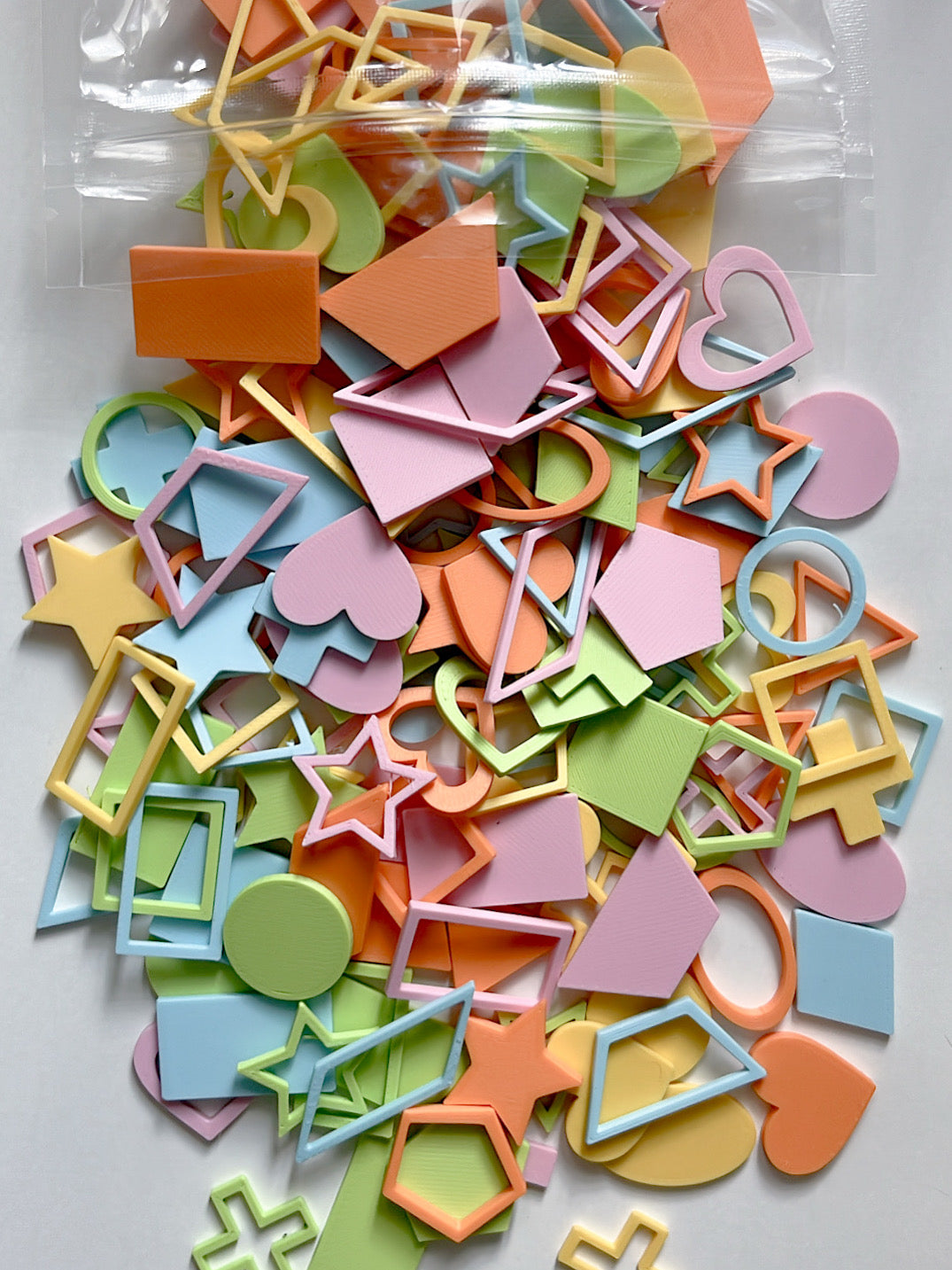 This forever lasting colorful 3D printed shape fillers make sensory play and learning fun and engaging. Each bag includes 14 different shapes in five bright colors, perfect for hands-on shape recognition and creative play activities. Durable and lightweight, they are ideal for sensory bins, classroom centers, or at-home learning.